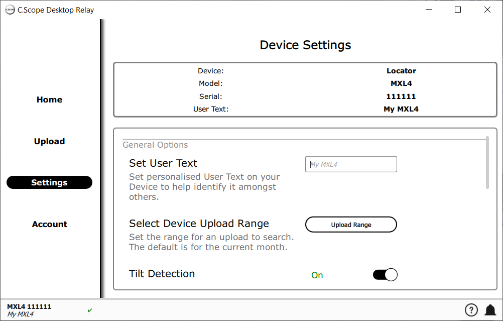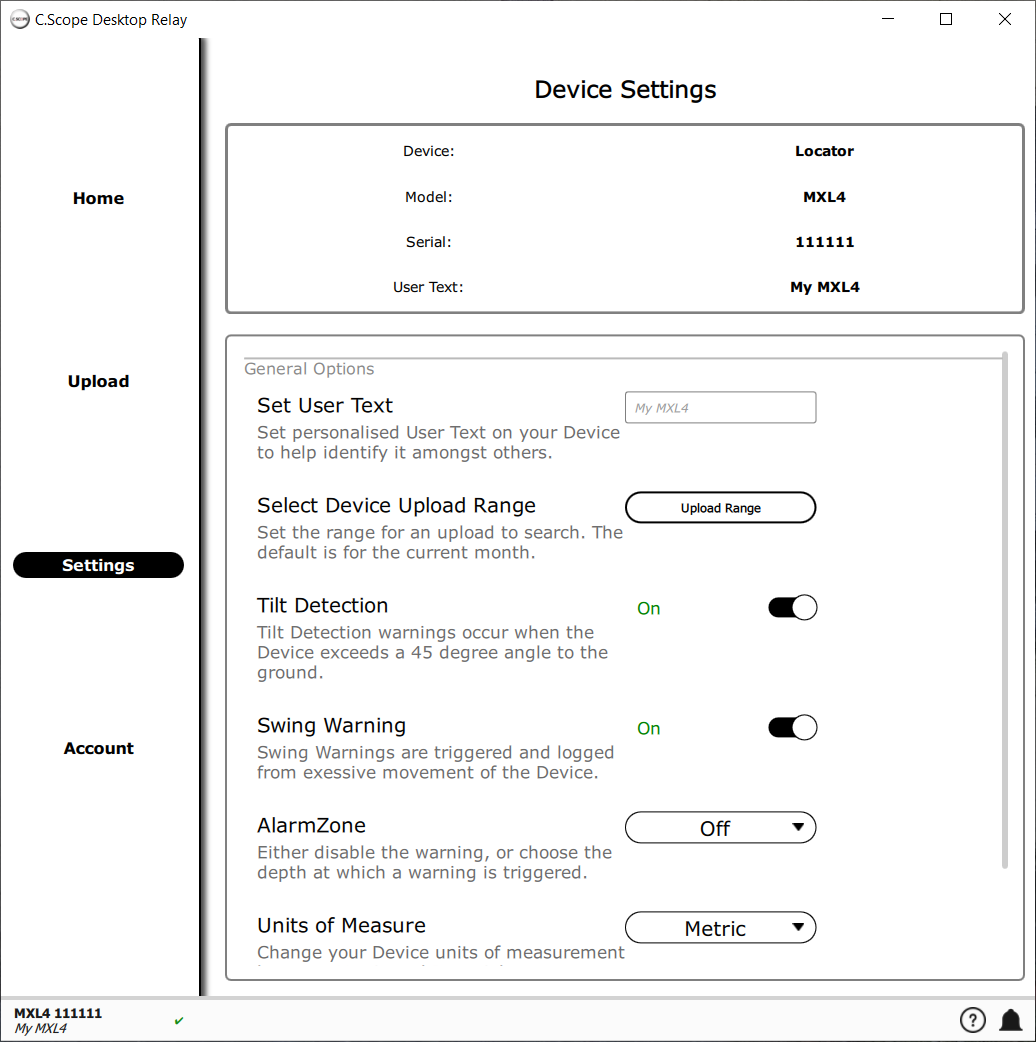 The Settings screen allows you to change settings on your device and the settings for the upload to cscope.info. Any changes you make in the Settings screen are sent to your device immediately, there's no need to save or confirm the changes.